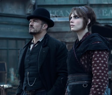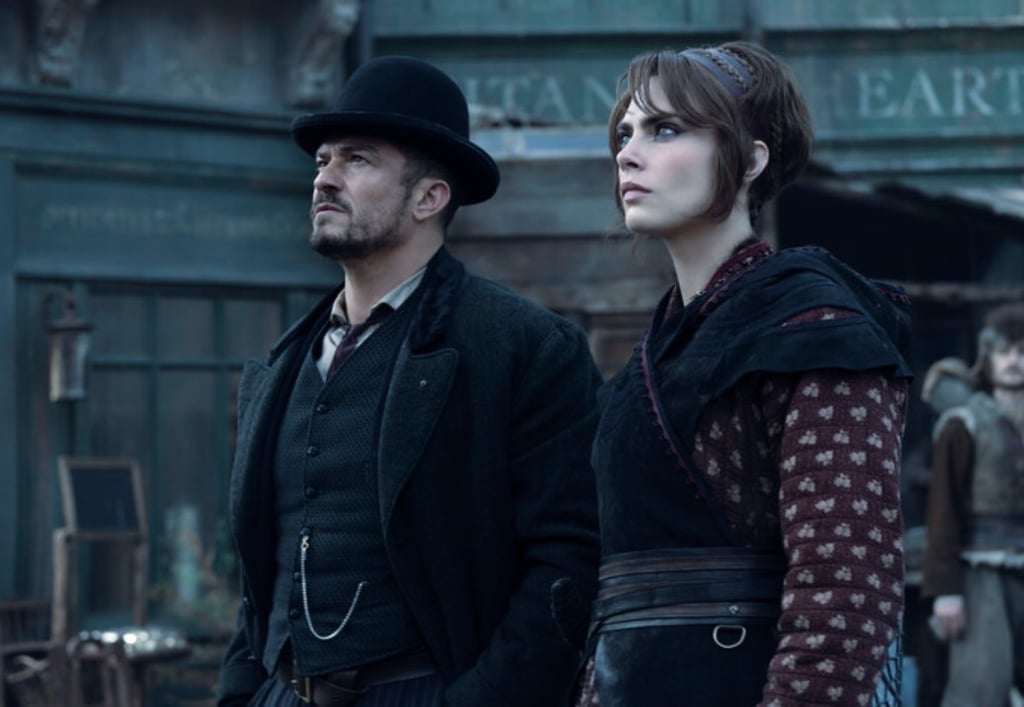Season one: We are shown a world of fairies, fauns, and witches, even glimpse of a centaur, stuck living in the ghetto of a late 1800’s England like Empire. They’re not treated well and it’s parallel to racism. They lack freedom and medical care, even food and shelter. All these creatures are here though as they’re victims of The Burges conquest for “Democracy” as they claim lands and territories in competition with other countries. We meet Philo (Orlando Bloom) who is a detective trying to find out what monster has been killing of fairies from the sewers. It isn’t until the third episode that we see him in a flashback as a soldier who was trying to establish dominance on a fairy claimed land. This is where he meets and falls in love with Vignette (Cara Delevingne).